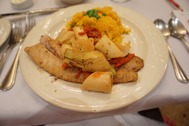 I had piping hot Cuban bread with grilled red snapper served over yellow rice and topped with hearts of palm, artichoke hearts, sun-dried tomatoes, extra-virgin olive oil, garlic and onions, a dish that’s aptly named Adelita, which translates “of the nobility” or in this case, fit for a king.