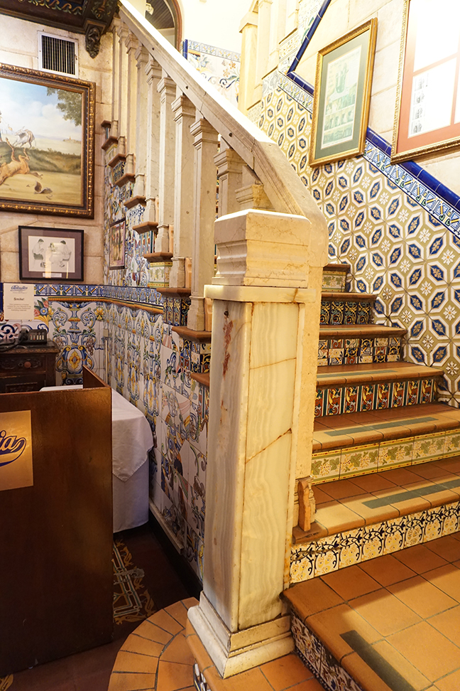 The camera on my shoulder and the fascination on my face prompted Constance to give a quick oral history of the place and an offer for a tour after lunch. I imagined myself the recipient of special press treatment, but it turns out that anyone who shows an interest can get a guided tour delivered by tall, elegant Cesar, the great grandson of the founding owner. I wish I could remember all the things he described as we walked the restaurant, but I was too gob-smacked by the 300-year-old stained glass, Cuban onyx stairs, priceless art and colorful Spanish tile.