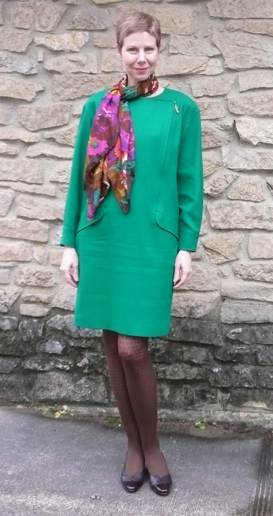 The pockets on this dress were a little worrisome, strategically placed across my widest dimension. But it works. The long diagonal zipper probably offsets the pocket factor. (I love the gold buttons and zipper charm.) Shoes and accessories were a quandary. Brown wouldn’t have been my first choice, but that’s what I had. Never underestimate the power of a scarf to meld unlikely things.